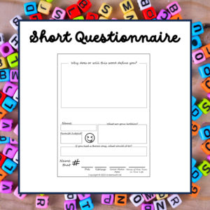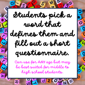 Ready to go back to school? This activity will help you and your students do just that! In this activity, you ask students to choose a word that they believe defines them, or that they would like to define them over the course of this next year. While this activity is individual, students often chat about their answers. Which makes for fun discussions.